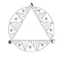 प्र.29 एक वृत्ताकार मेज़ पोश जिसकी त्रिज्या सेमी. है, में बीच में एक समबाहु त्रिभुज ABC छोड़ते हुए एक डिज़ाइन बना हुआ है, इस डिज़ाइन का क्षेत्रफल ज्ञात कीजिए।