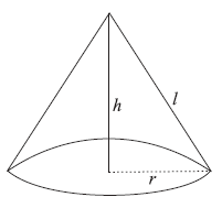 जहाँ l = तिर्यक ऊँचाई, h = शंकु की ऊँचाई, r = शंकु की त्रिज्या